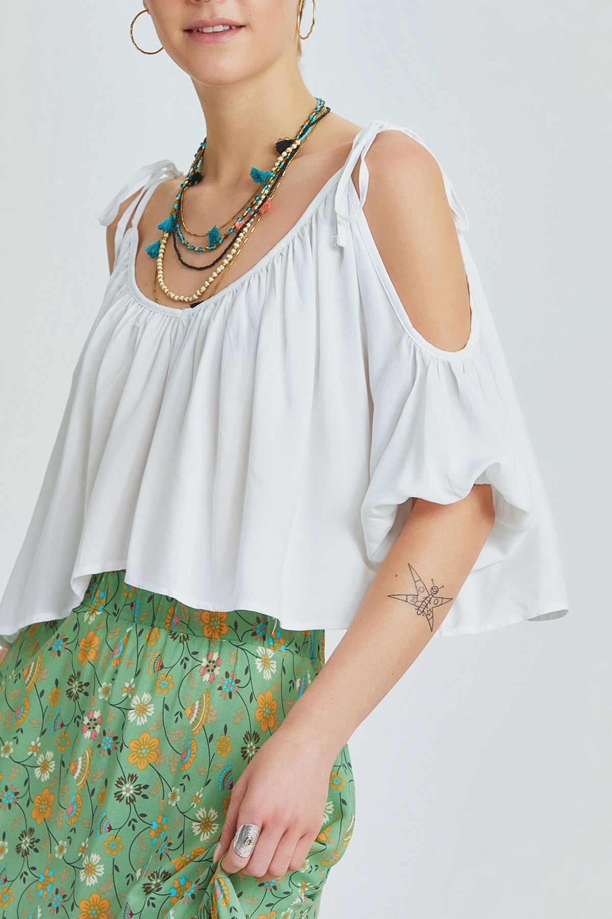 White Viscose Crop Blouse with Wide V-Neck and Off-Shoulder Design